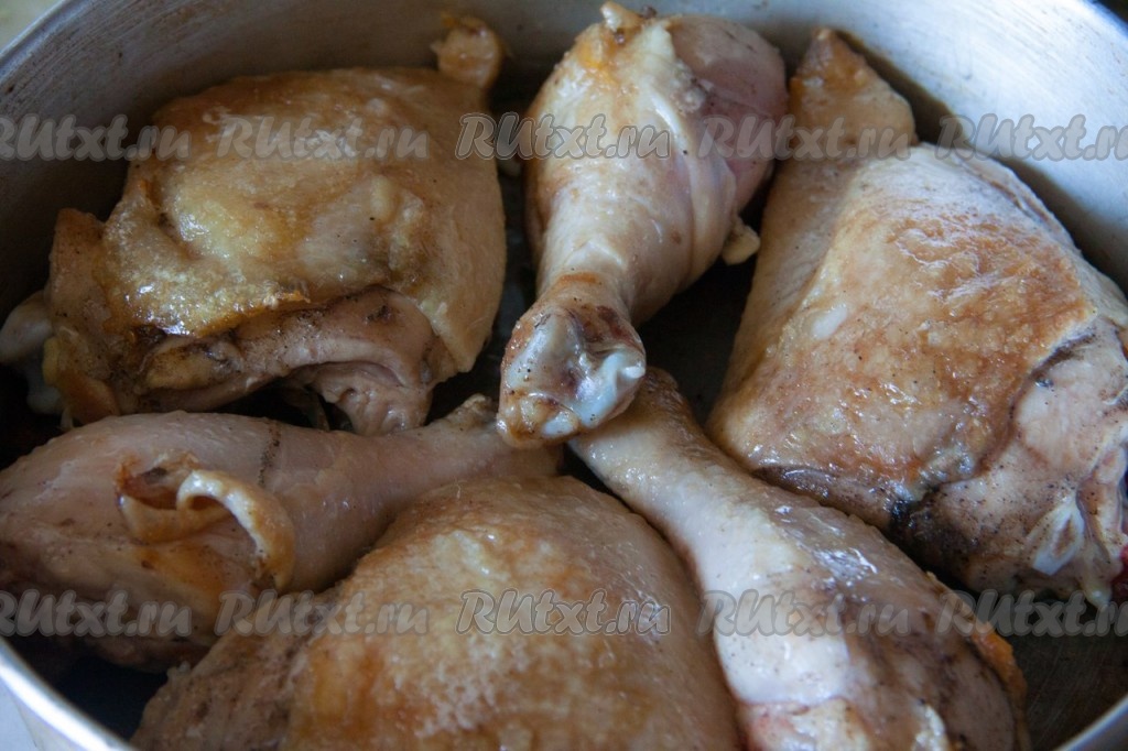 Курицу разделить на порционные кусочки, посолить и поперчить. На сковороде разогреть растительное масло, выложить кусочки курицы и обжарить их на сильном огне до золотистой корочки со всех сторон. Обжаренную курочку убрать со сковороды.
