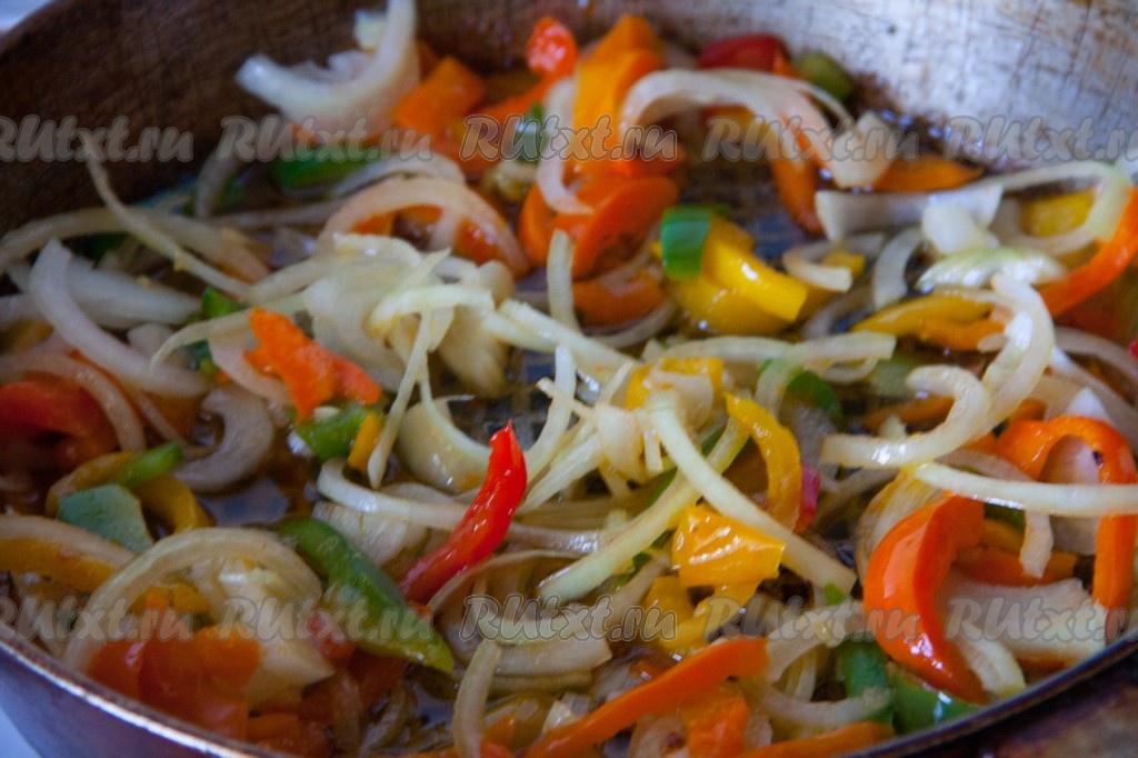 В форму для запекания, смазанную маслом, выложить обжаренные кусочки курицы, болгарский перец с луком и чесноком.