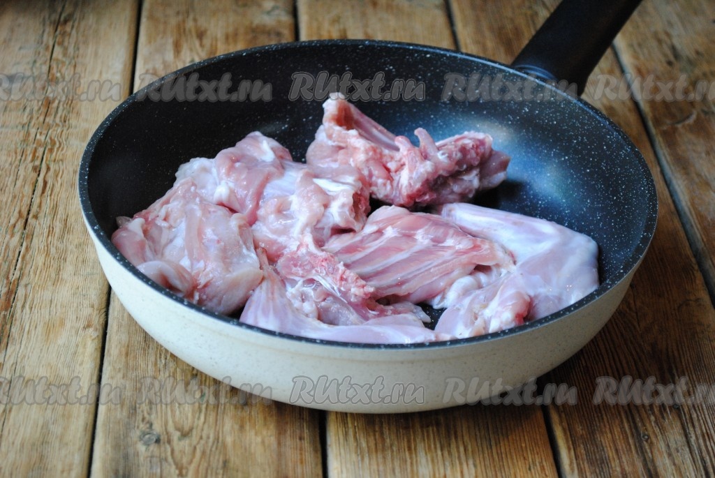 Сковороду с небольшим количеством растительного масла хорошо разогреть. Выложить на сковороду мясо кролика и обжарить на большом огне с двух сторон до румяной корочки.