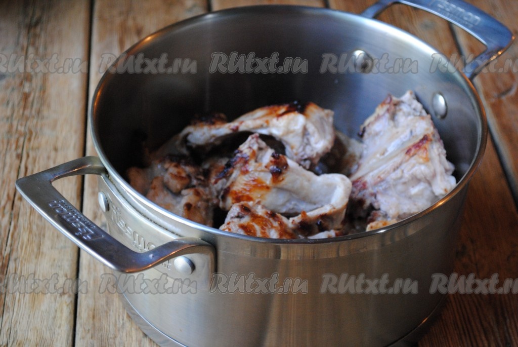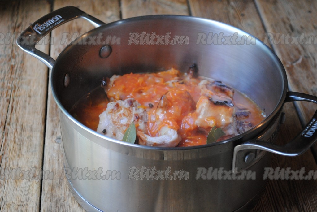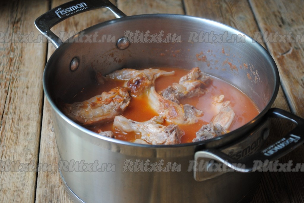 Томатную подливу вылить в кастрюлю с обжаренными кусочками кролика, влить воду, добавить душистый перец горошком и лавровые листья.