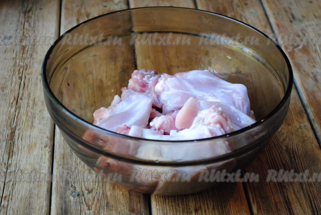 Мясо кролика хорошо вымыть и нарезать на порционные кусочки. Как правило, мясо для гуляша нужно срезать с костей и нарезать небольшими кубиками. Но в этот раз я решила нарезать кролика на порционные кусочки, не срезая мясо с костей.