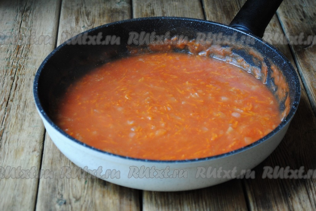 Затем влить к обжаренным овощам томатный сок, добавить сахар и соль по вкусу, довести до кипения, уменьшить огонь и готовить получившуюся томатную подливку ещё 5 минут.