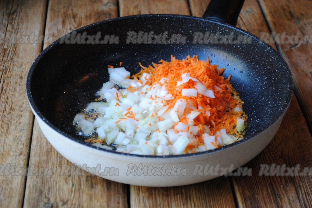 В сковороду, где обжаривалось мясо, выложить лук и морковь.