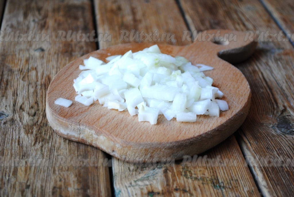 Лук и морковь очистить. Лук нарезать небольшими кубиками.