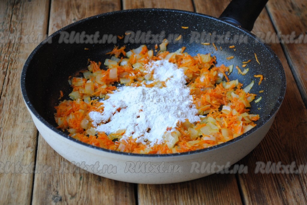 Обжаривать морковку с луком на небольшом огне, периодически помешивая, около 5 минут. Овощи должны стать мягкими. Затем всыпать муку и хорошо перемешать. Жарить, иногда помешивая, ещё пару минут.