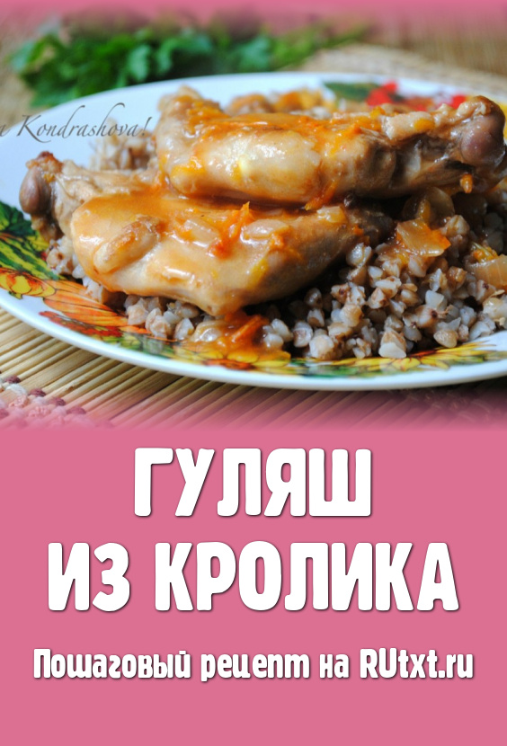Отправить кастрюлю с гуляшом из кролика на огонь, довести до кипения. Затем кастрюлю накрыть крышкой и тушить гуляш на небольшом огне 40-60 минут. Время тушения будет зависеть от возраста животного. Гуляш можно считать готовым, когда мясо станет мягким и будет легко прокалываться ножом или вилкой.