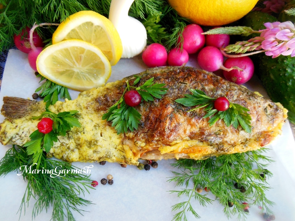 Форму накройте фольгой, поставьте в духовку. Так как у меня стеклянная форма, я духовку заранее не разогреваю, а отправляю форму с карасями в холодную духовку. Запекайте карасей в сметанном соусе при температуре 180 градусов 25-30 минут, за 5 минут до готовности фольгу снимите и дайте рыбе зарумяниться.