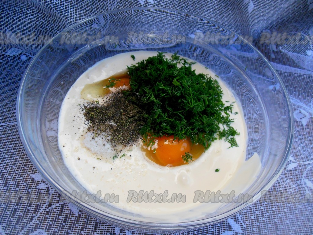 Для приготовления сметанного соуса смешайте сметану, яйца, мелко нарезанный укроп, соль и черный молотый перец.