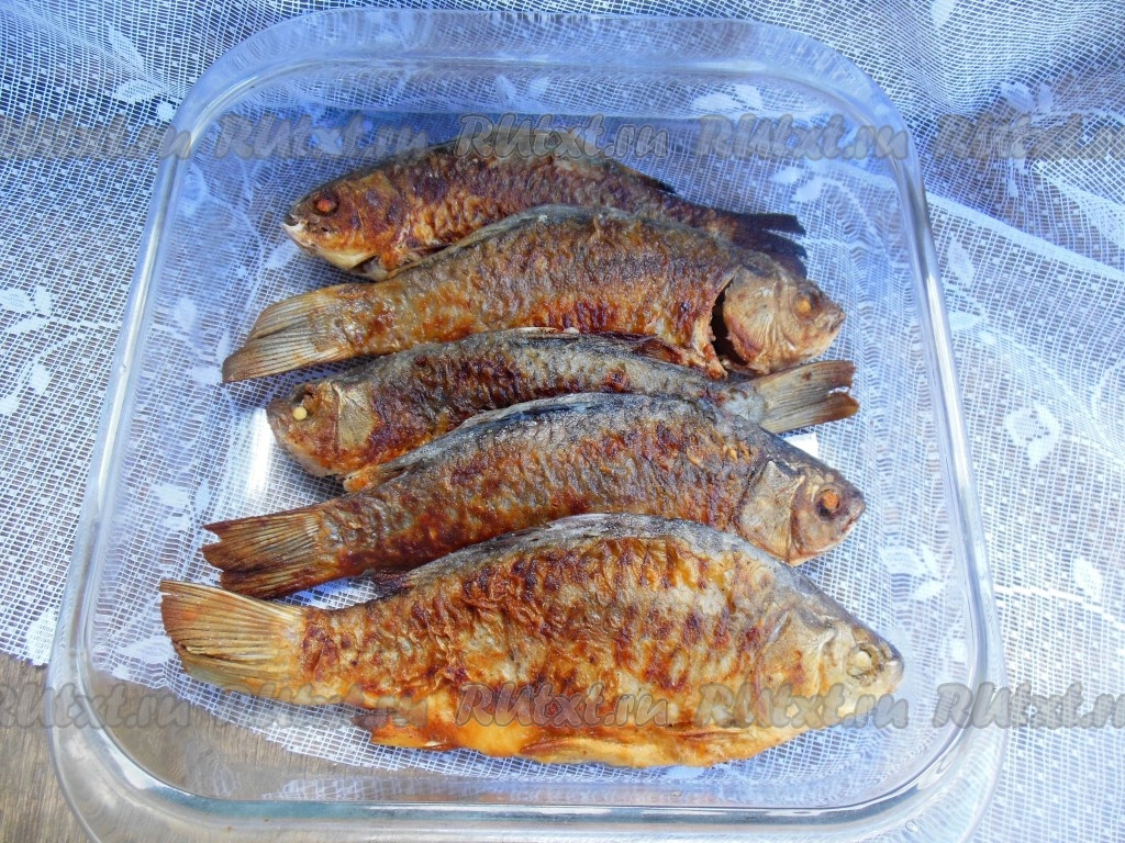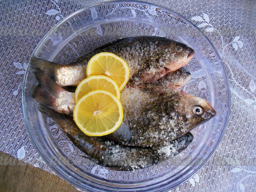 Свежих карасей очистите от чешуи и внутренностей, удалите из головы жабры. Хорошо промойте под проточной водой, удалите черную пленочку внутри карасей (она дает горечь рыбе).