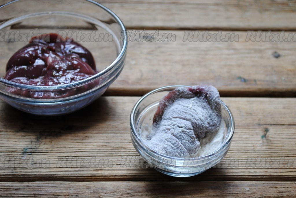 Обжарить её по 3 минуты с каждой стороны на среднем огне. Готовая печень должна стать золотистой и при лёгком надавливании будет выделяться светлый сок, а не кровь. Готовую печень переложить со сковороды на бумажное полотенце, чтобы убрать лишнее растительное масло.