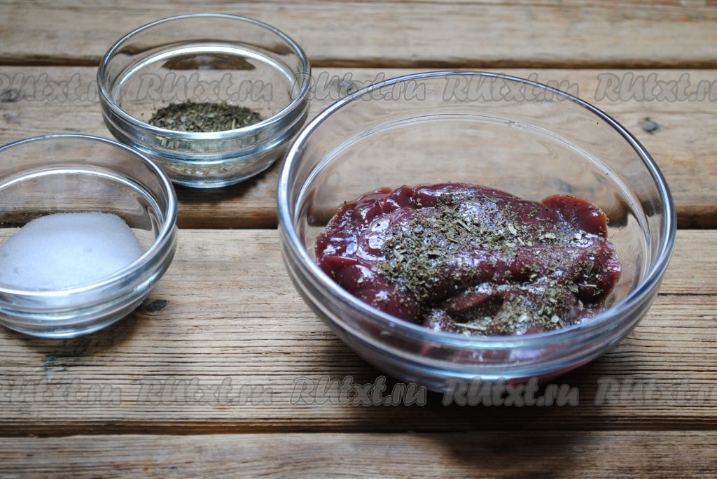 Печень вымыть, обсушить, срезать все висящие плёнки, разрезать печень на небольшие кусочки. Печенку посолить и приправить итальянскими травами.