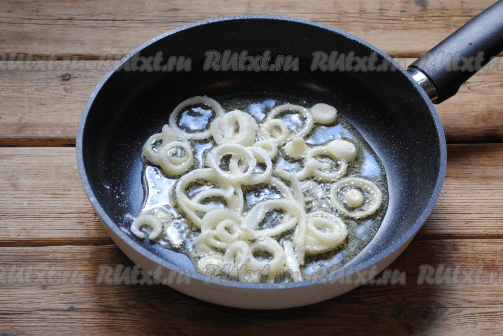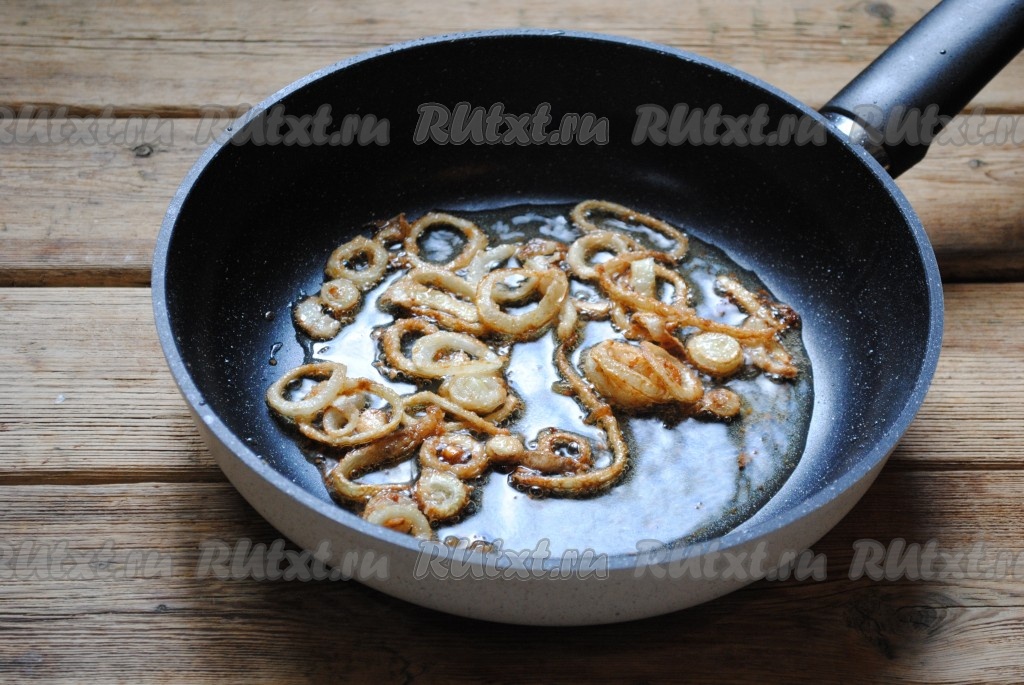 В сковороду налить растительное масло, оно должно полностью покрывать дно сковороды, хорошо его разогреть. Затем выложить лук и, постоянно помешивая, обжарить его до золотистого цвета.
