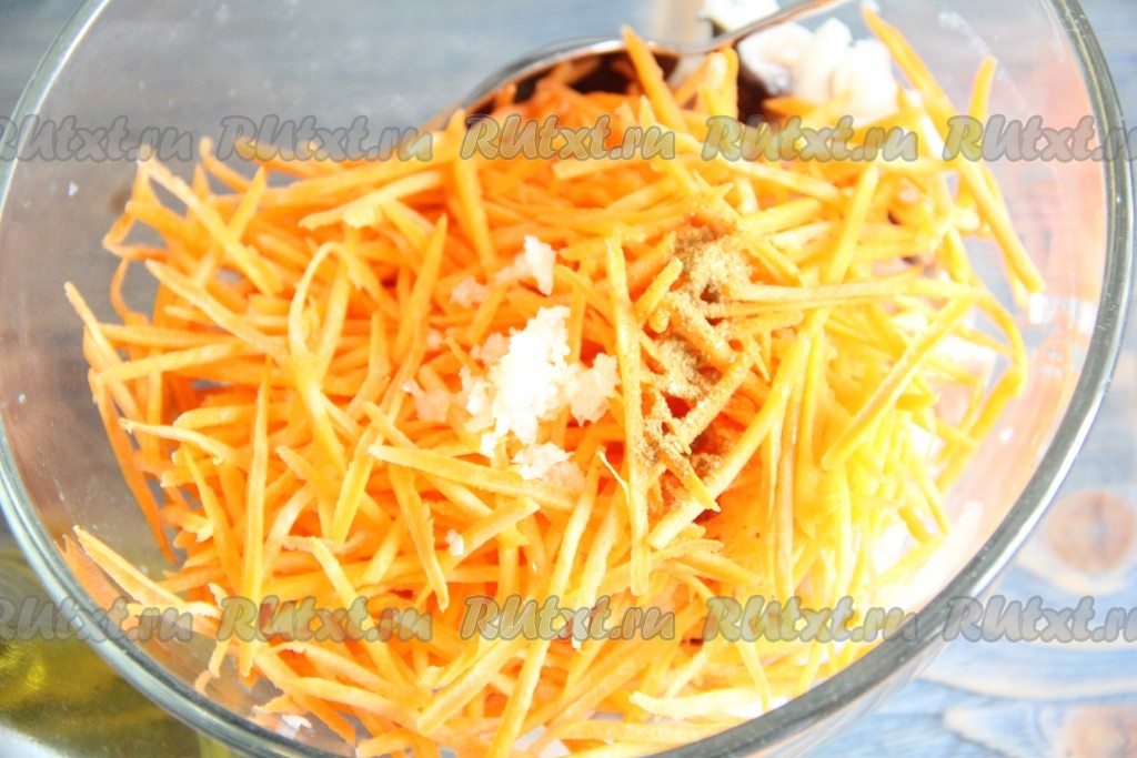 Затем добавить морковь, приправу для корейской моркови, соль и чеснок, пропущенный через пресс, хорошо перемешать.