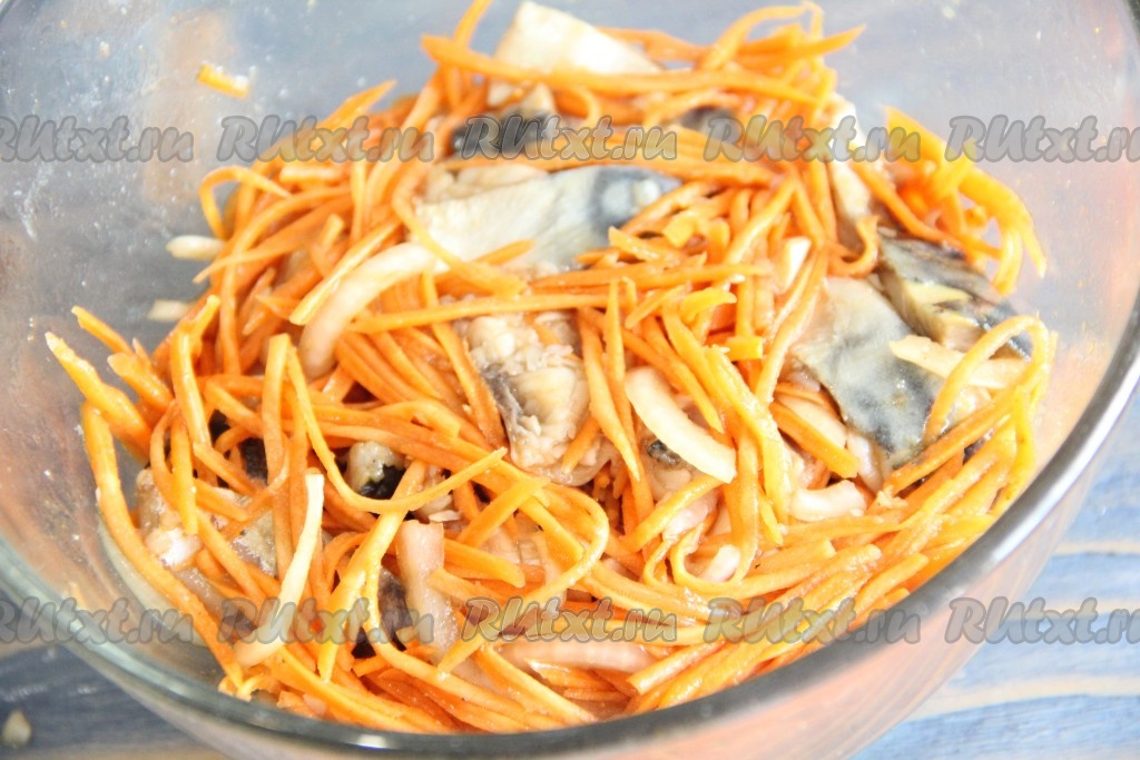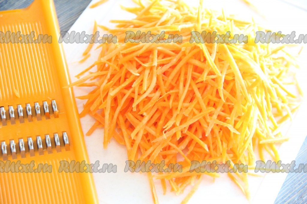 Пока наша рыба маринуется, приготовить овощи. Морковь очистить и натереть на тёрке для корейской моркови.