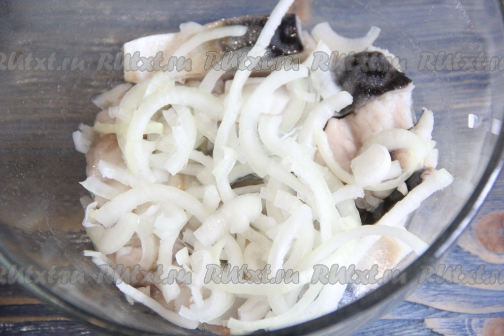 Скумбрию вымыть, затем разделать на филе и нарезать на кусочки.