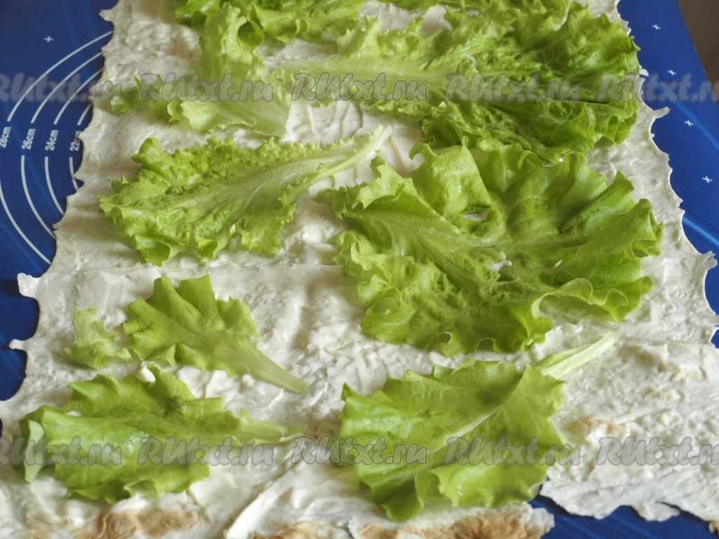 На столе разложить лист лаваша и смазать плавленным сыром. Салатные листья промыть и обсушить, разложить сверху.