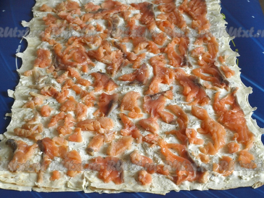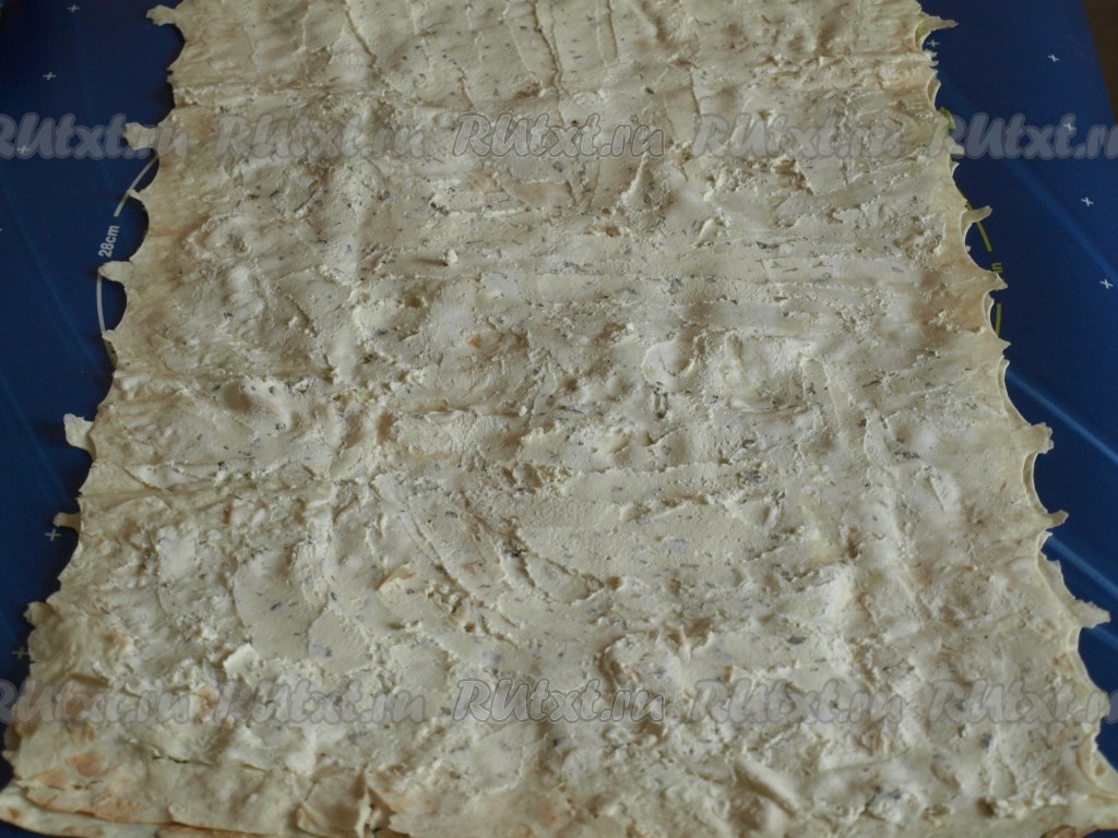 Сверху положить второй лист лаваша и смазать его творожным сливочным сыром.