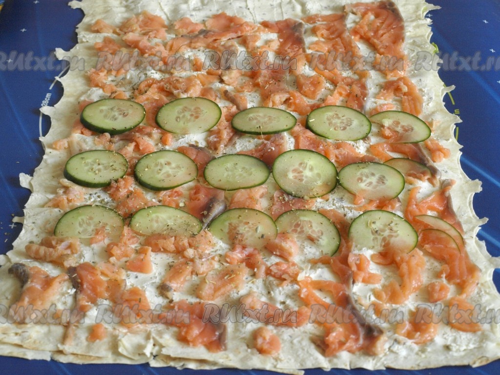 Тонко нарезать огурчики и разложить их по центру в 3 ряда. Посыпать немного солью и орегано.