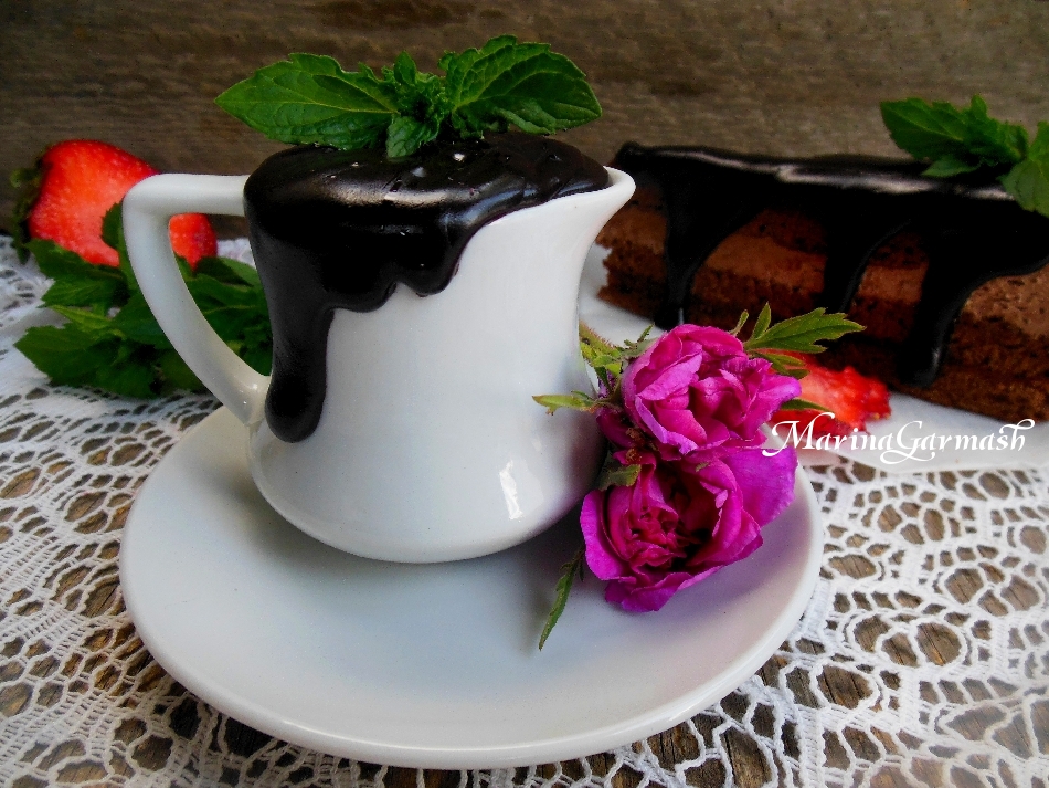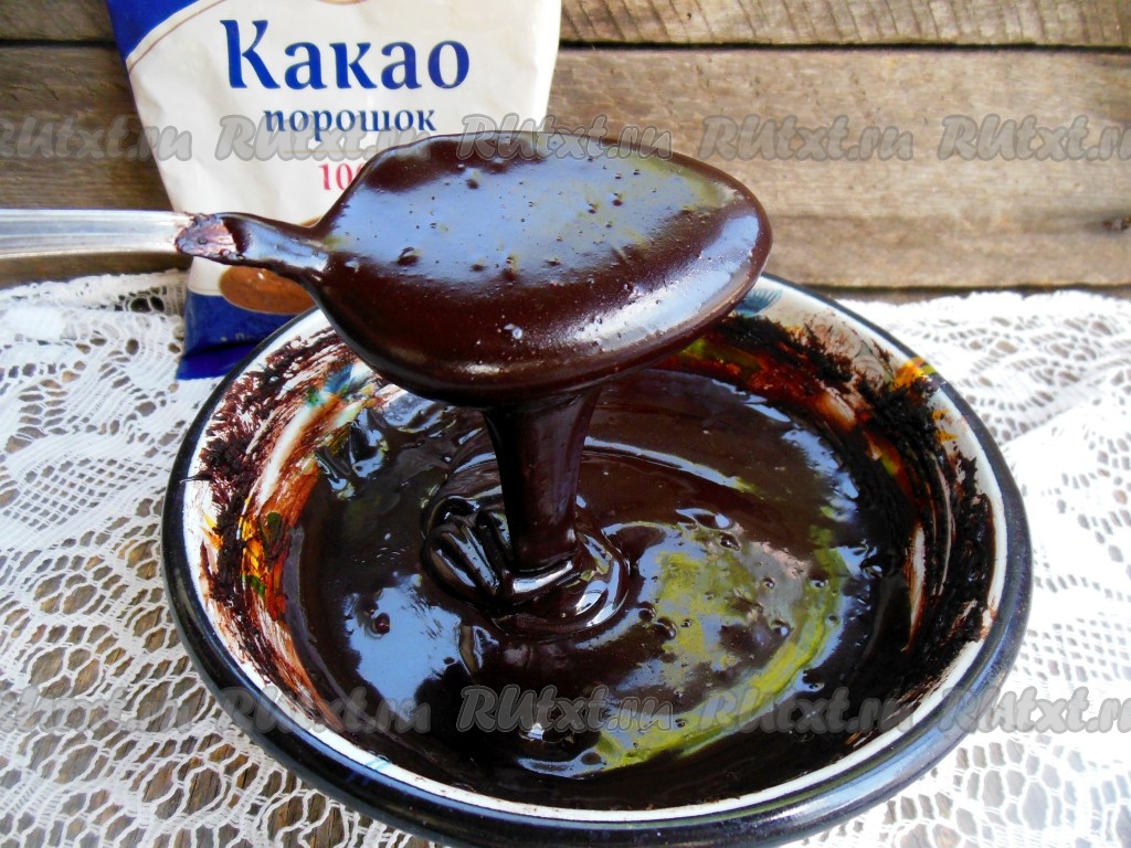 Шоколадная глазурь из какао и сметаны готова, теперь можно наносить ее на выпечку. Хранится она пару дней в холодильнике. На фото видно, как глазурь смотрится на тортике.