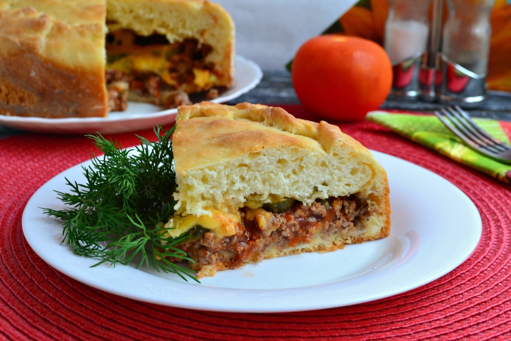 Дать готовому пирогу немного остыть в форме, затем его вынуть и остудить до теплого состояния на решетке. Вкусный и очень сочный пирог с мясным фаршем из дрожжевого теста нарезать и подать к столу.