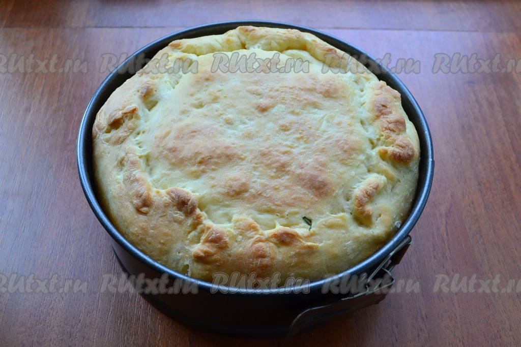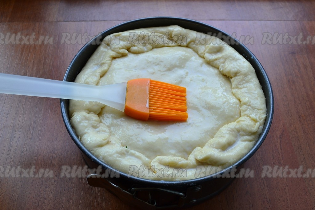 Меньшую часть теста раскатать по диаметру формы и накрыть тестом пирог. Края нижней части теста завернуть вовнутрь и немного защипнуть стыки. Смазать пирог сверху теплым молоком.