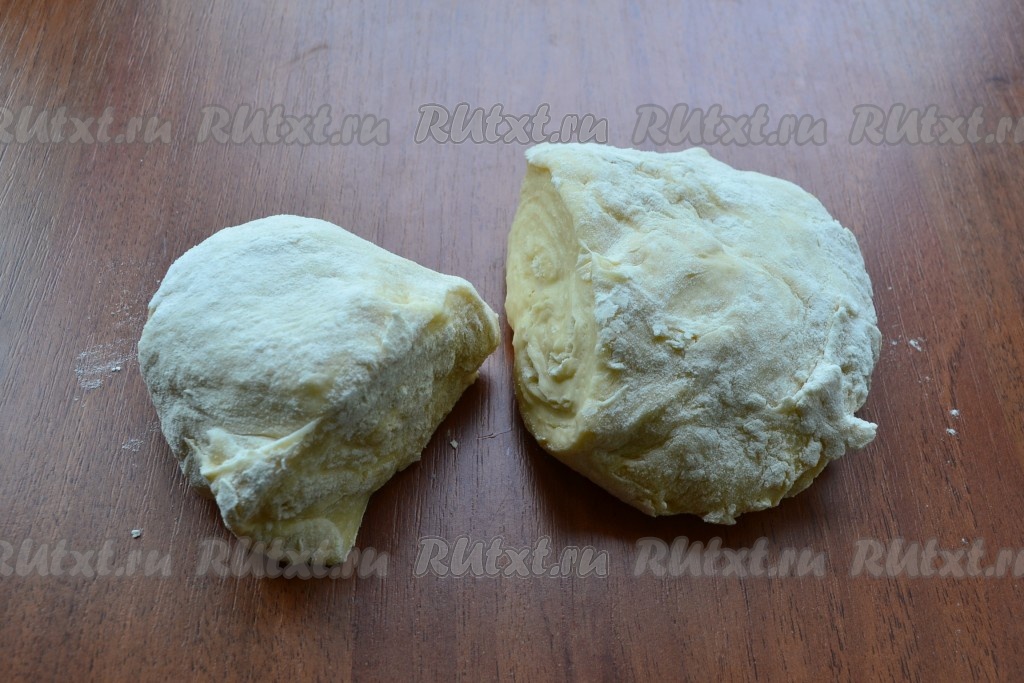 Подошедшее тесто обмять и разделить его на 2 части: одну - побольше, другую - поменьше.