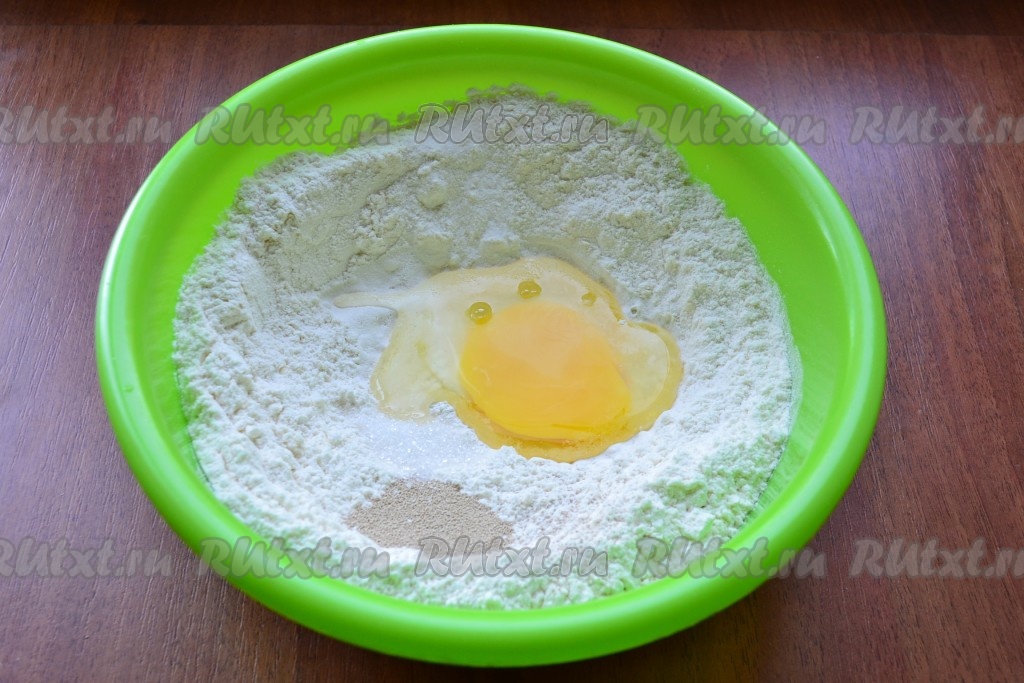 Для приготовления теста в просеянную муку добавить сырое яйцо, соль, сахар и сухие дрожжи.
