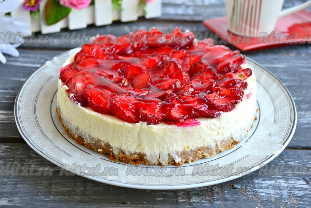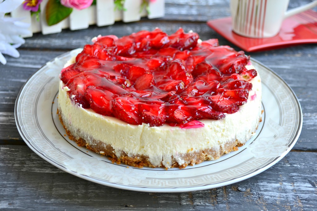 Желе приготовить по инструкции на упаковке, только воды взять в 2 раза меньше. Чуть желе остудить и залить им клубнику. И снова отправить творожный чизкейк в холодильник часов на 6-8. Далее чтобы вынуть замечательный, красивый и очень вкусный творожный чизкейк с клубникой из формы, нужно нагреть нож и провести им по краю формы. Вынуть чизкейк и поместить его аккуратно на блюдо.