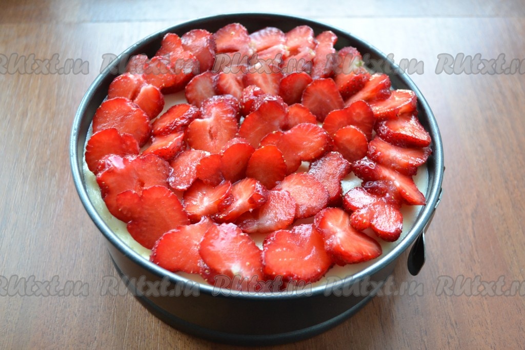Клубнику нарезать как вам удобно и выложить ее слоем сверху чизкейка.
