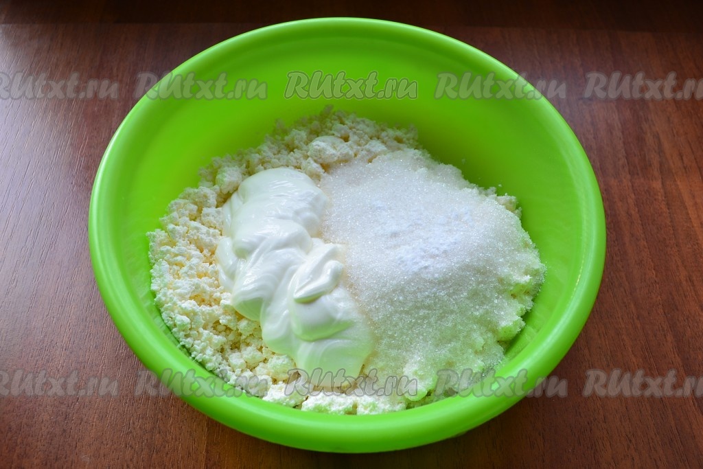 К творогу добавить сметану, всыпать сахар и ванилин.