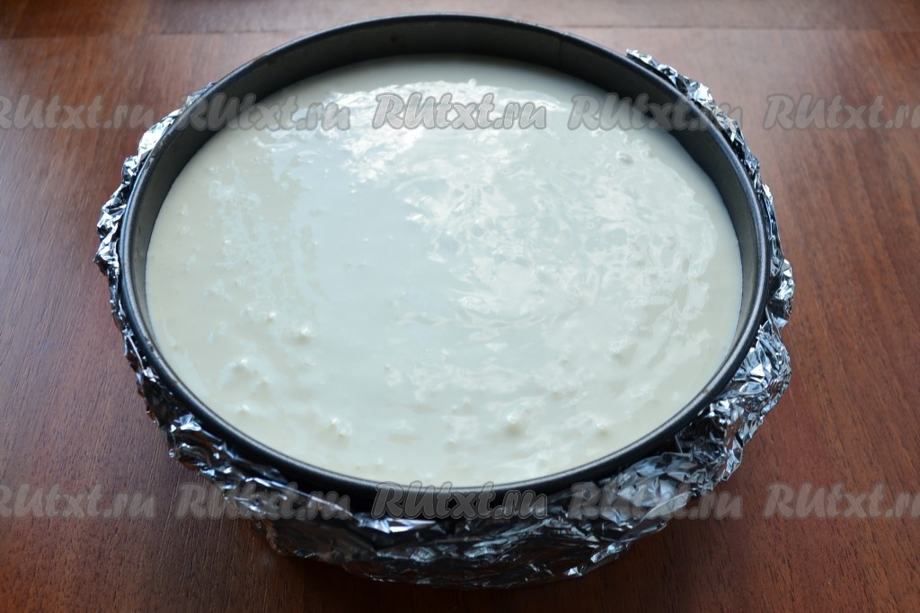 Творожную массу вылить поверх коржа из печенья. Дно и бока формы завернуть в 3 слоя фольги.