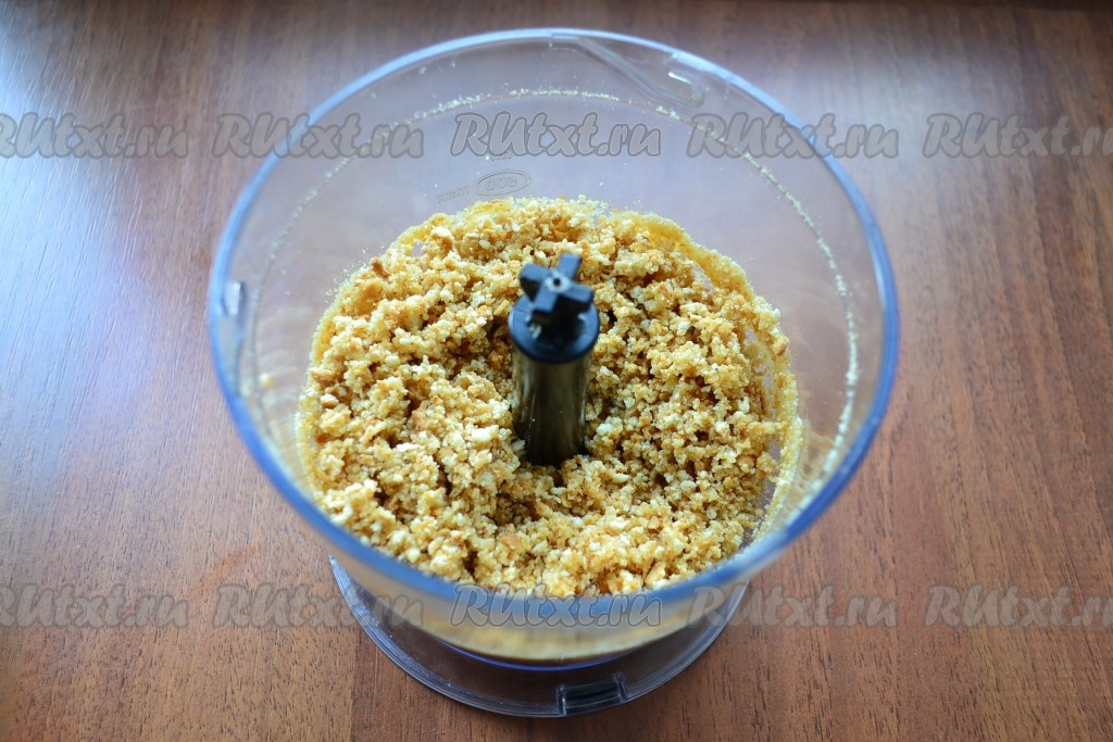 Печенье поломать, поместить в чашу блендера, измельчить. Масло сливочное растопить и остудить. Влить масло в печенье и все перемешать блендером.