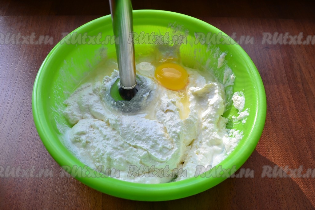 Взбить все погружным блендером до однородности. Продолжая взбивать, добавить по одному сырые яйца, каждое яйцо должно хорошо смешаться с творожной массой.