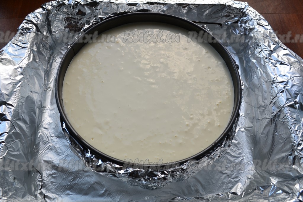 Поместить форму с чизкейком в большую по объему форму, влить горячую воду, чтобы она была до половины формы с десертом.
