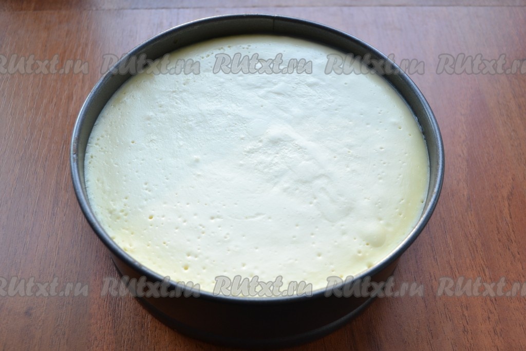 Отправить всю конструкцию в разогретую до 150-160 градусов духовку на 50-60 минут. Верх чизкейка, если начнет запекаться, накрыть листом фольги - нам нужно, чтобы верх пирога остался светлым. Готовность чизкейка проверяется небольшим встряхиванием - творожный слой должен быть плотным, только серединка может немного вибрировать. Вынуть форму с чизкейком из воды, духовку выключить и оставить в ней пирог еще на 30 минут. После этого снять фольгу с формы и дать чизкейку остыть. Далее поместить творожный чизкейк прямо в форме в холодильник на пару часов.