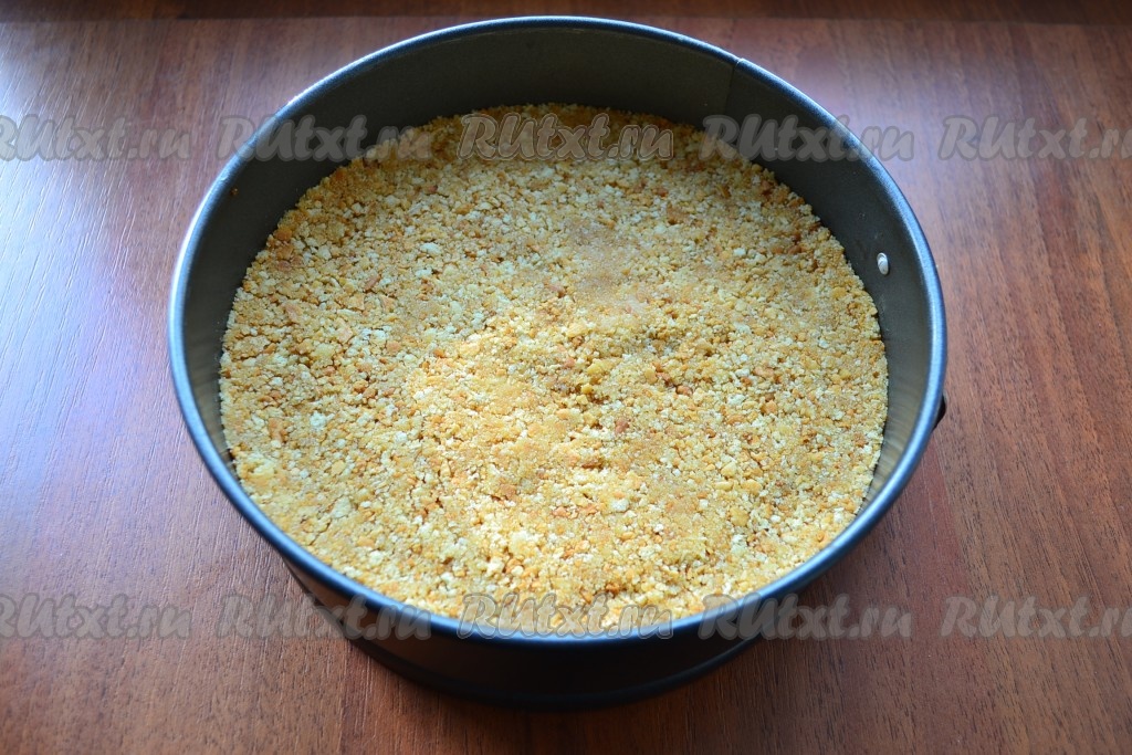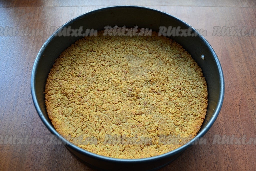 Разъемную форму диаметром 17-18 см застелить пергаментом (дно), выложить крошку из печенья и масла, хорошенько утрамбовать.