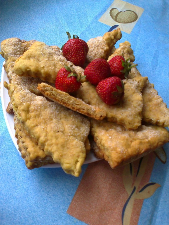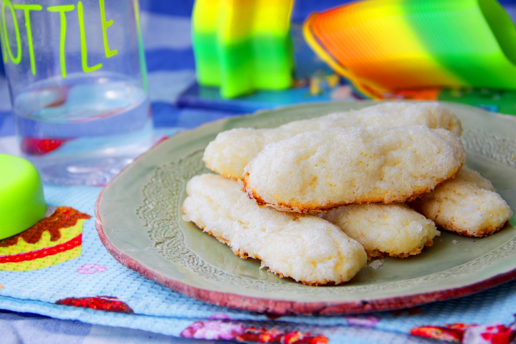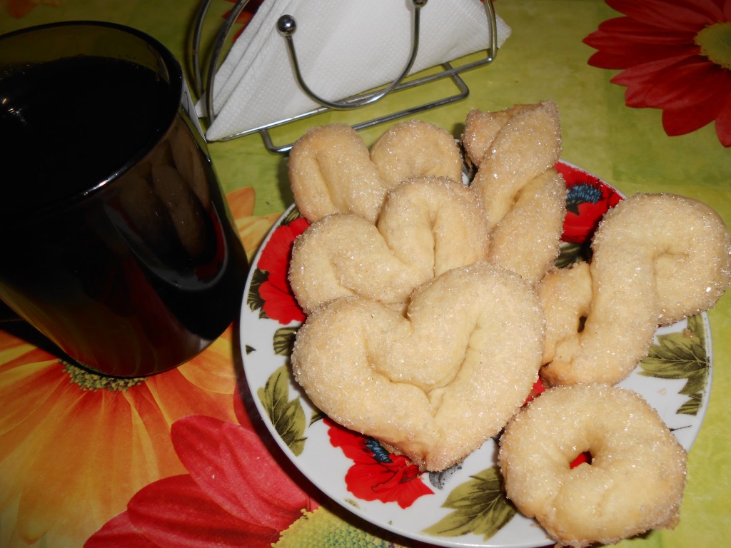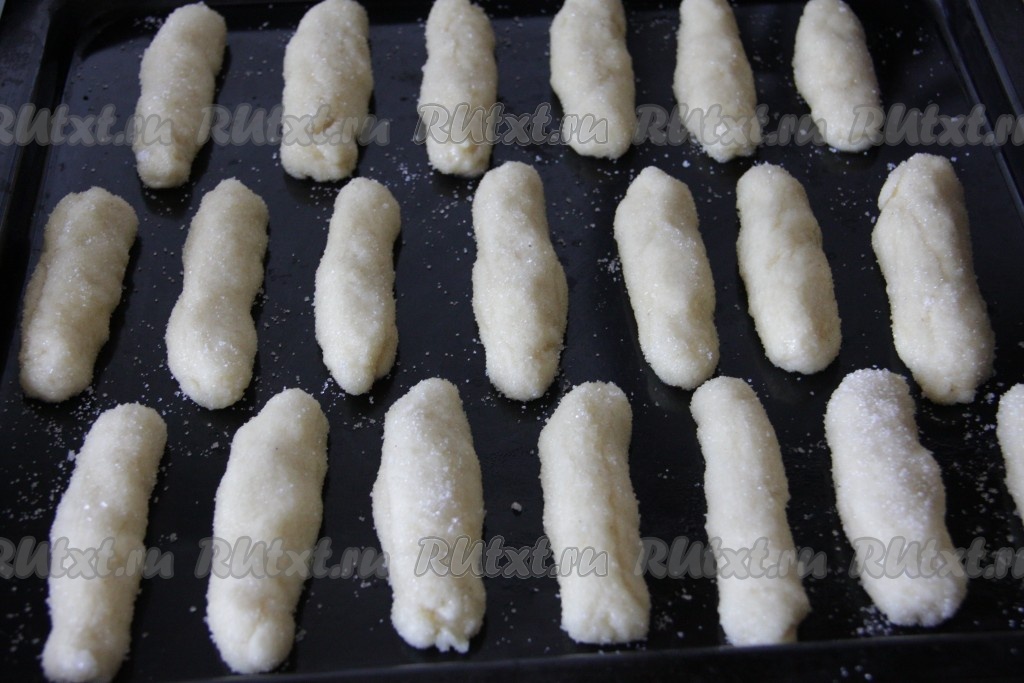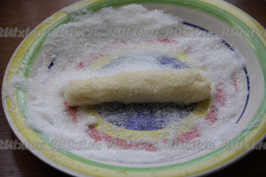 Это простое и быстрое печенье формируется без раскатки теста. На плоскую тарелку насыпаем 2-3 столовых ложки сахара. От теста отщипываем кусочек, формируем из него колбаску (можно сформировать тесто и в форме шариков или придать ему руками любую другую форму). Равномерно обваливаем эту колбаску из теста в сахаре со всех сторон.