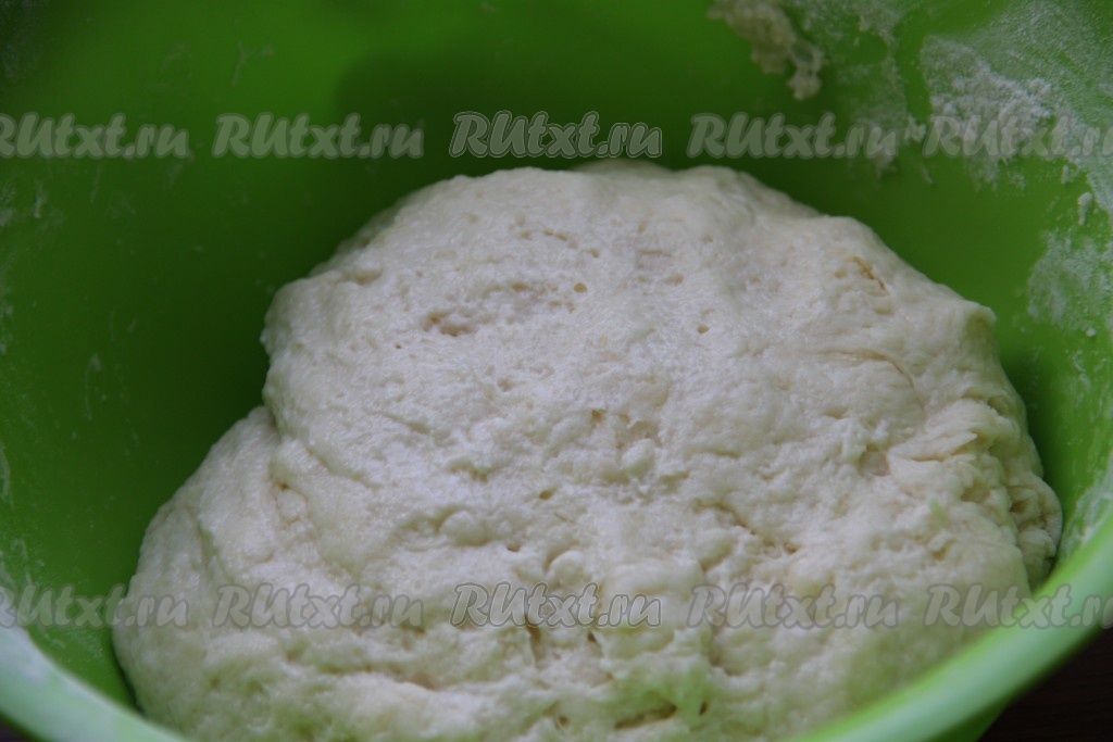 В получившуюся смесь всыпаем разрыхлитель, 1 столовую ложку сахара и начинаем частями всыпать муку. Вначале перемешиваем тесто ложкой, а когда оно начнёт собираться в ком, понемногу добавляя оставшуюся муку, замешиваем очень мягкое, воздушное тесто, которое будет слегка липнуть к рукам. Тесто должно быть именно немного липнущим, но лишнюю муку добавлять не нужно. При желании, чтобы проще было работать с тестом, можно просто слегка смазать руки растительным маслом.