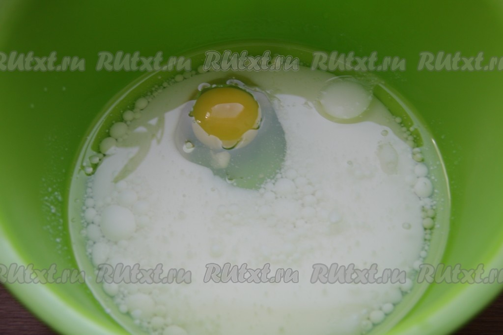 Желательно, чтобы кефир был комнатной температуры (кефир можно подогреть в течение 20 секунд в микроволновке, либо просто заранее достать его из холодильника, чтобы он успел согреться при комнатной температуре). В миске соединяем кефир комнатной температуры, растительное масло и яйцо, перемешиваем до однородности венчиком (или вилкой).