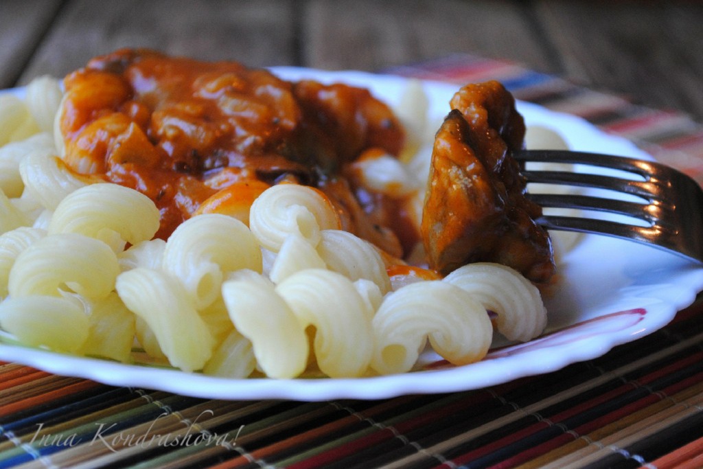 Очень вкусный гуляш из куриной печени готов, подавать его в горячем виде с отварным рисом, гречкой или макаронными изделиями.