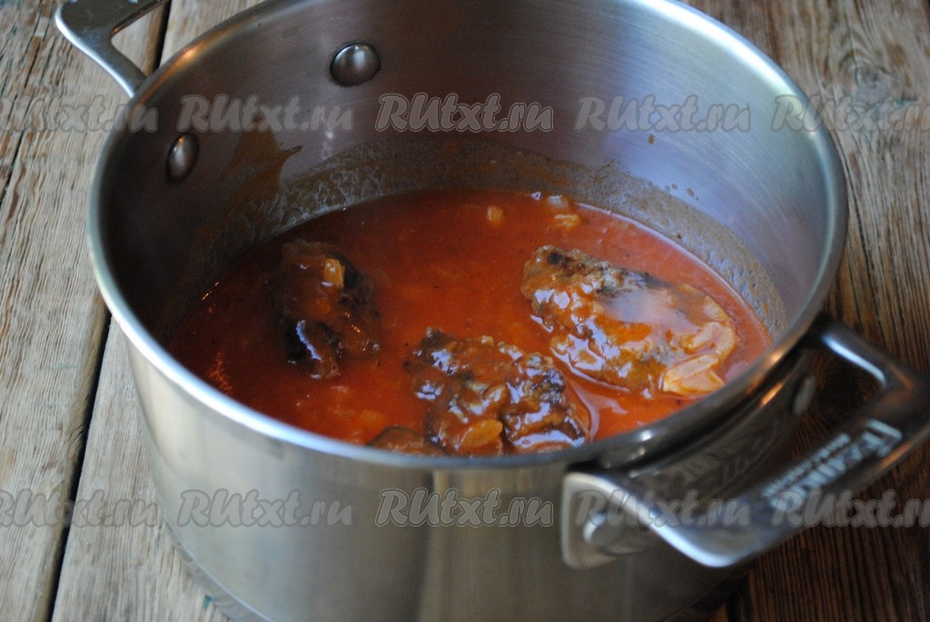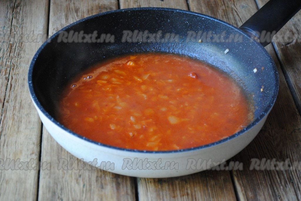 Получившийся томатный соус перемешать и готовить ещё 2 минуты на небольшом огне, затем добавить соль, сахар и чёрный молотый перец по вкусу.
