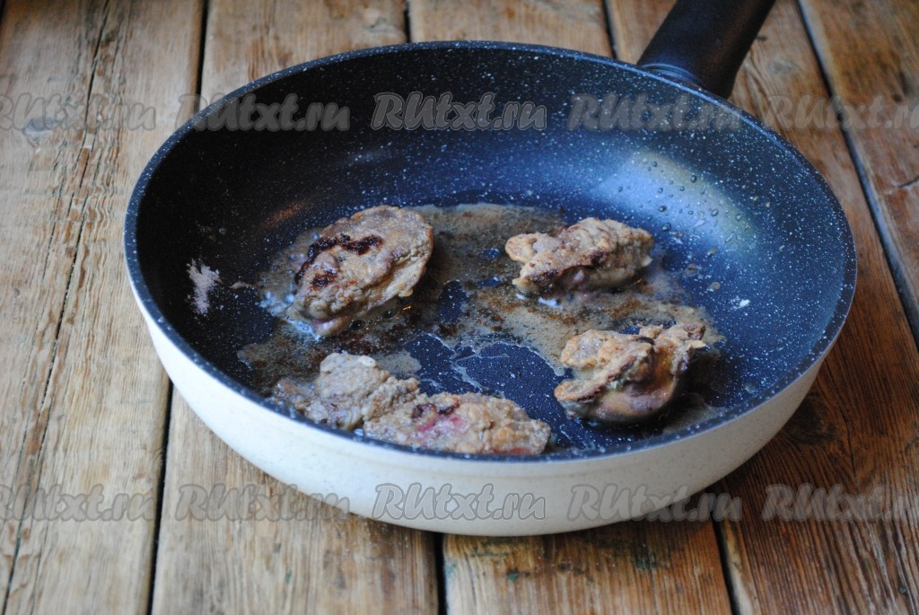 Обжарить куриную печень на сильном огне по 1-2 минуты с каждой стороны. На печени должна появиться золотистая корочка. Обжаренную печень переложить в небольшую кастрюлю.
