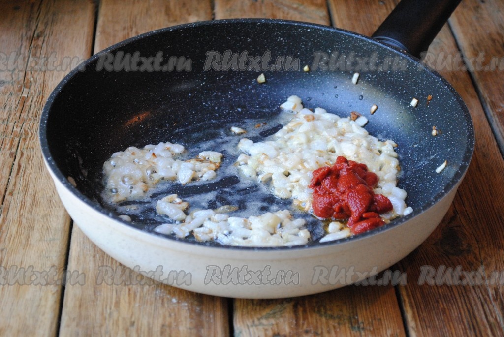 В мягкий и слегка золотистый лук всыпать 1 чайную ложку муки и хорошо перемешать, добавить томатную пасту и влить воду.