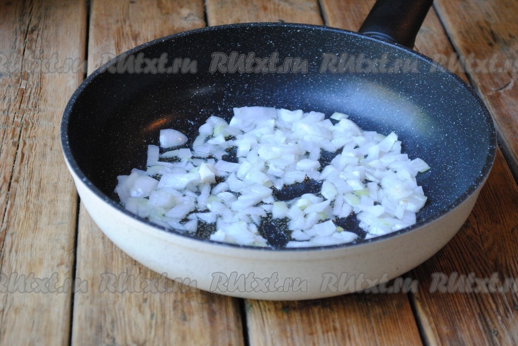 Очищенный лук, нарезанный небольшими кубиками, обжарить на растительном масле до золотистого цвета, периодически помешивая (в течение 2-3 минут).