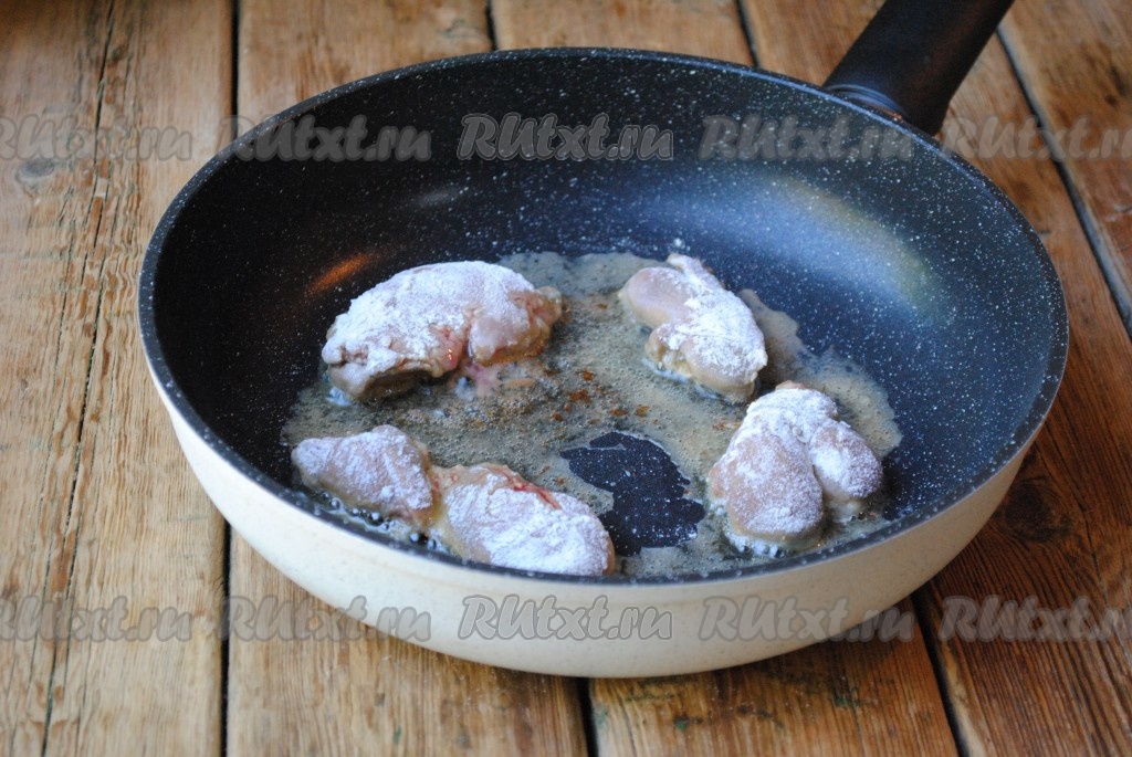 Куриную печень вымыть, удалить прожилки и обсушить. Печенку посолить и поперчить по вкусу. В сковороде разогреть небольшое количество растительного масла. Каждый кусочек печени обвалять в муке. На разогретую сковороду выложить кусочки печени. Печенку лучше выкладывать на сковороду в один слой. Если сковорода небольшая и вся печень не помещается, обжаривайте её в несколько приёмов.