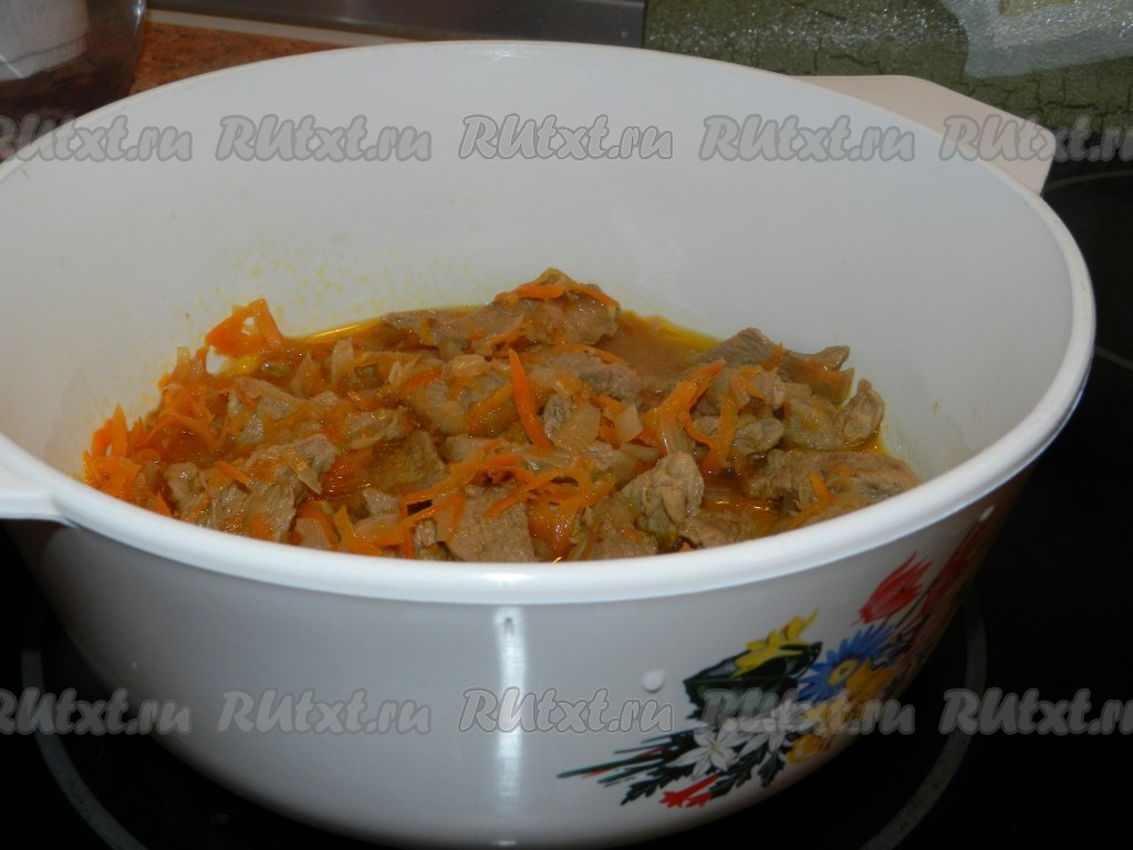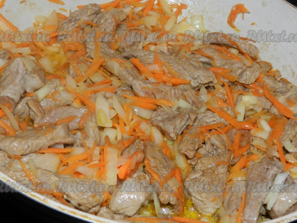 Телятину нарезать на кусочки, лук - полукольцами, морковь натереть на терке. Сначала обжарить на сильном огне мясо, до образования румяной корочки, затем огонь уменьшить, добавить лук и морковь, обжарить все вместе до золотистого цвета овощей.