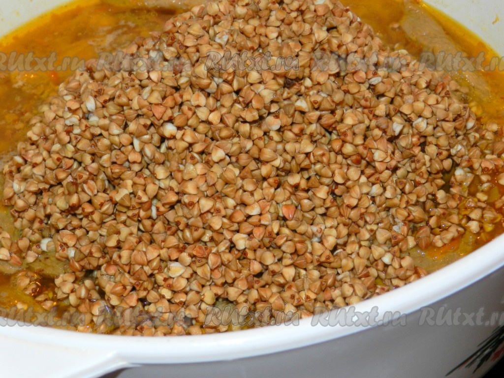 Когда телятина будет почти готова, добавить промытую гречневую крупу, перемешать, добавить горячей воды на 1,5 см выше уровня крупы. Накрыть крышкой и варить еще примерно 40 минут до готовности.