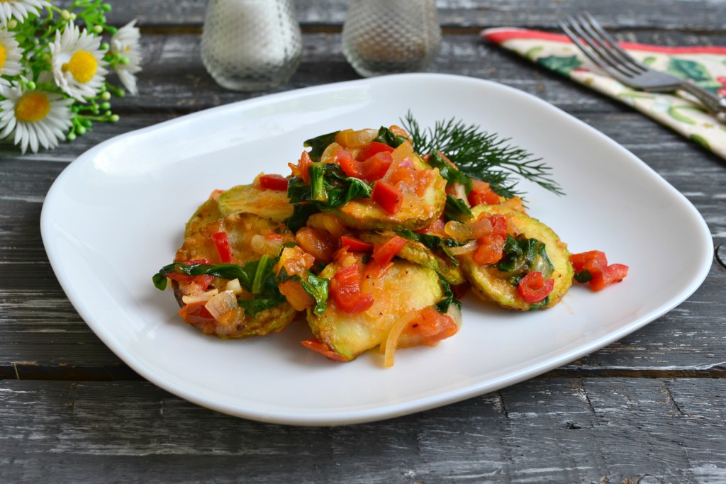 Перемешать содержимое сковороды, протушить около 1 минуты и добавить обжаренные кружочки кабачка.
