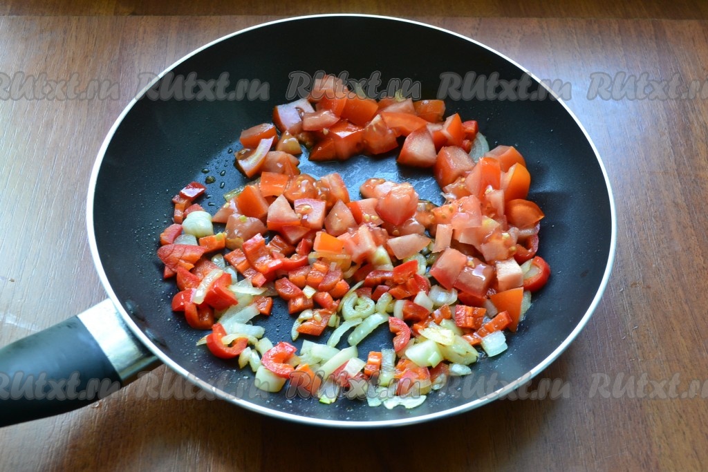 В сковороду влить немного растительного масла, выложить лук и болгарский перец, обжарить овощи на среднем огне в течение 2 минут, помешивая, далее добавить помидоры. Посолить, перемешать и обжаривать в течение 4-5 минут, иногда перемешивая.