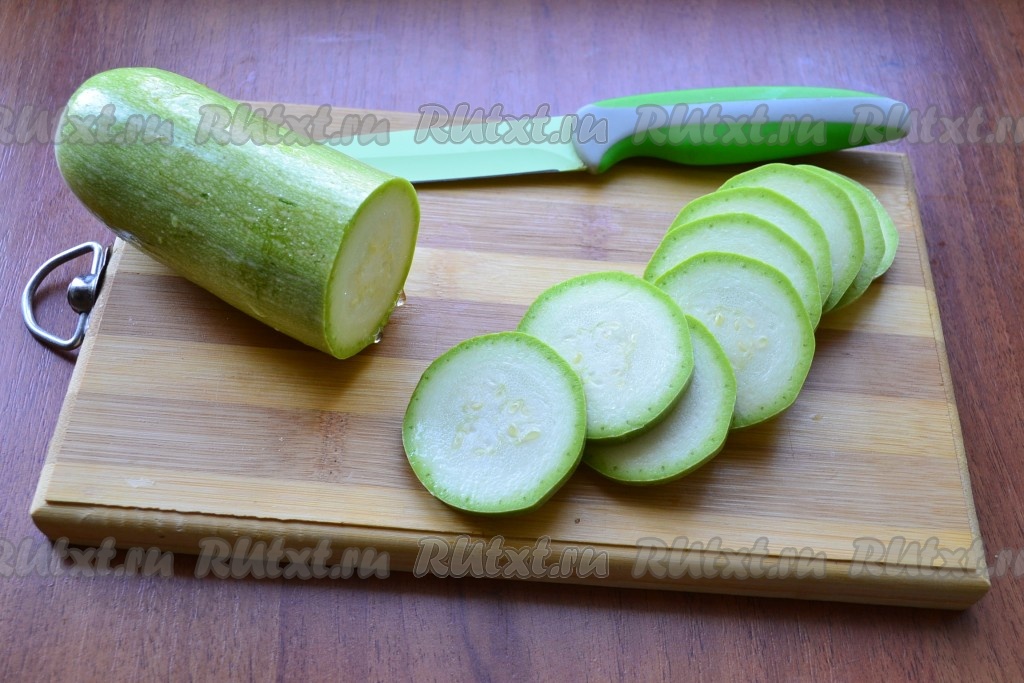 Кабачок (молодой кабачок можно готовить вместе с кожурой) вымыть, обсушить, нарезать кружочками толщиной около 0,5 см.